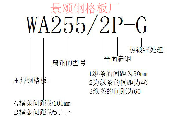 3.WA255/2P-G鋼格板的型號表示:
