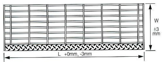 踏步板公差:寬度W±3mm,長度L-3mm。保護(hù)板的尺寸為65mm×5mm,僅在客戶需要時才切角,可按特殊規(guī)格定做。兩側(cè)板的包邊與每根受荷扁鋼均采用單邊焊接,焊縫為不小于3mm角焊。